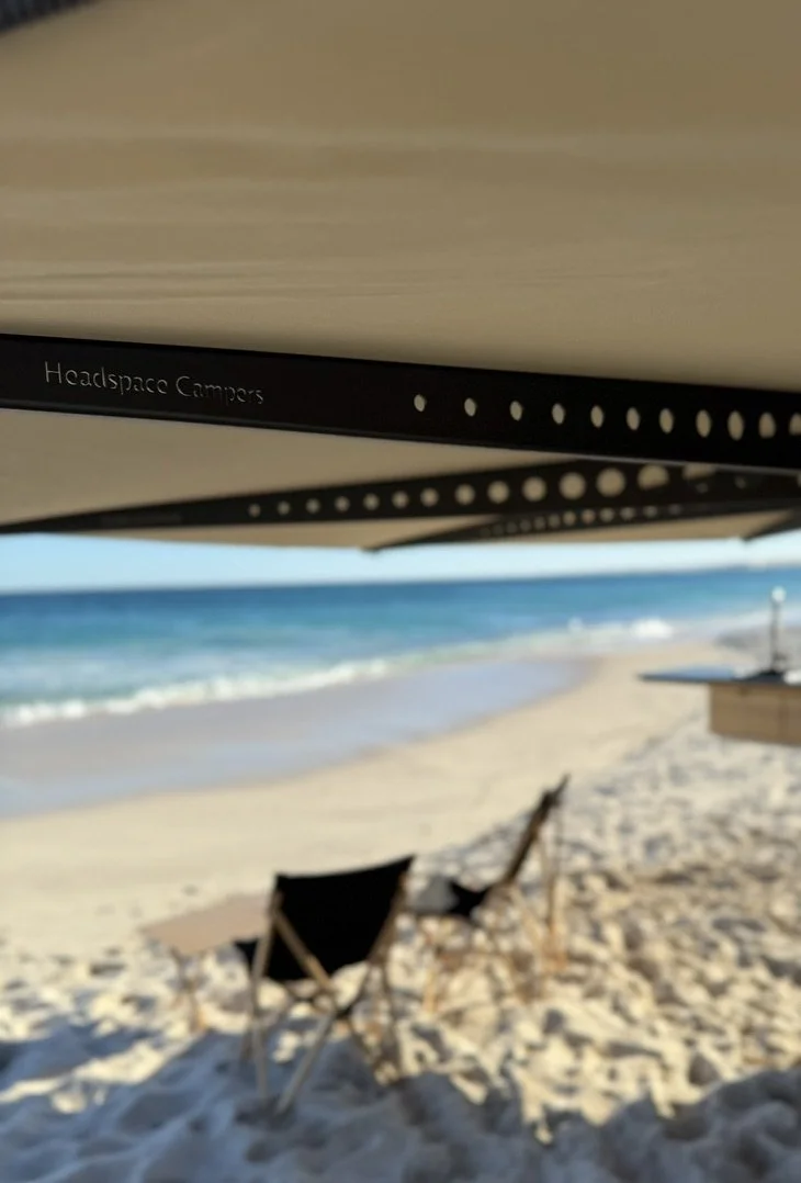 Stand-alone vehicle-mounted awning providing over 16sqm of shade coverage. Powder coated aluminium frame with 380GSM ripstop canvas to match tent on roof conversion.